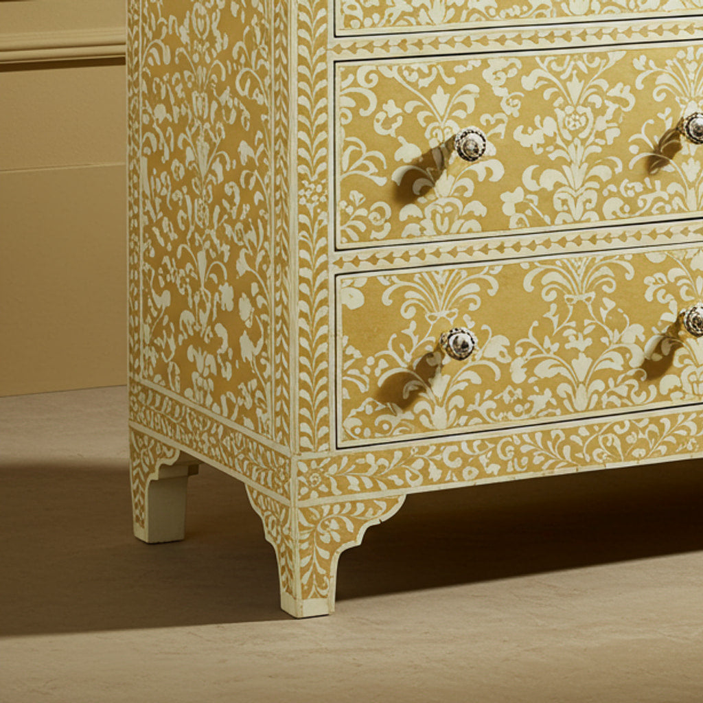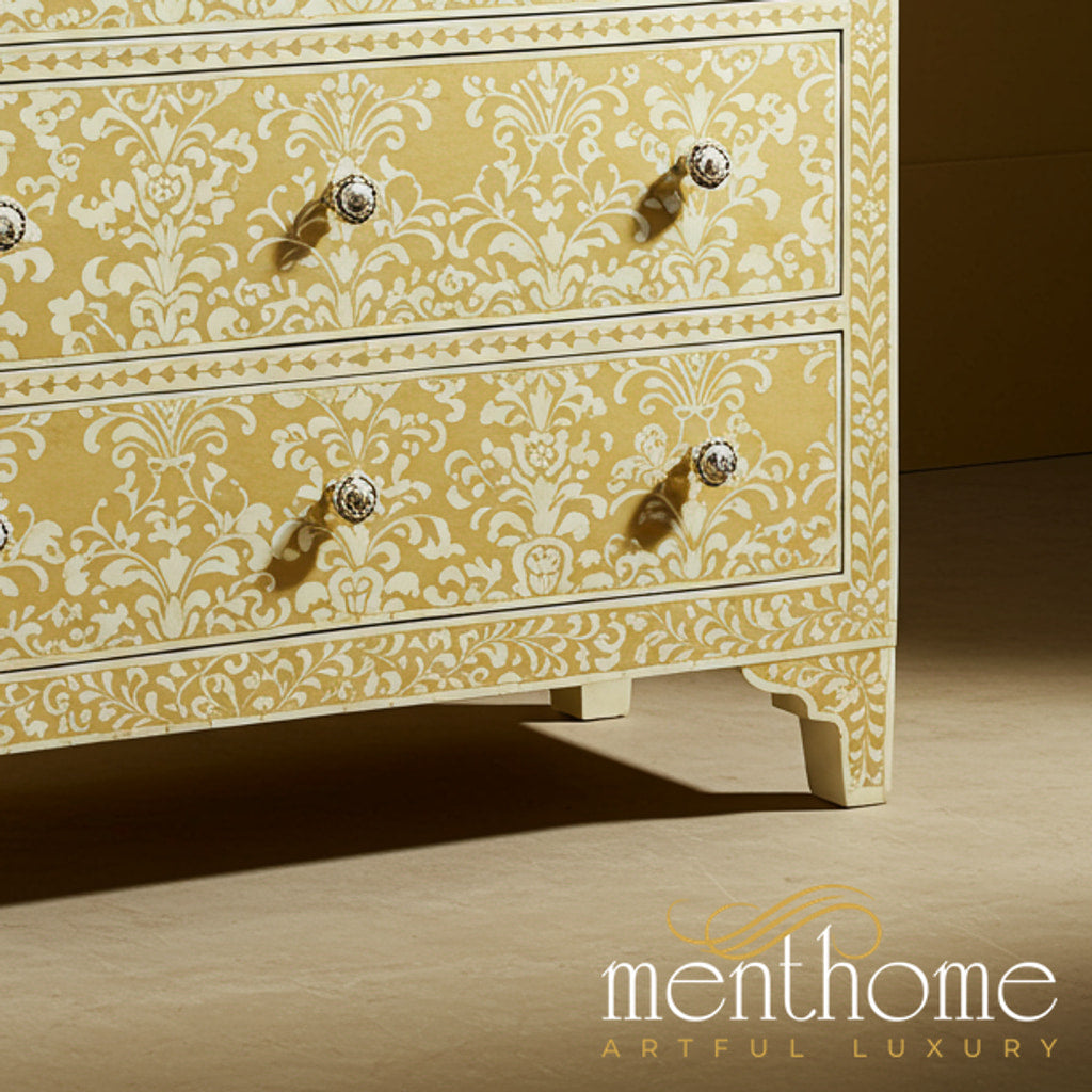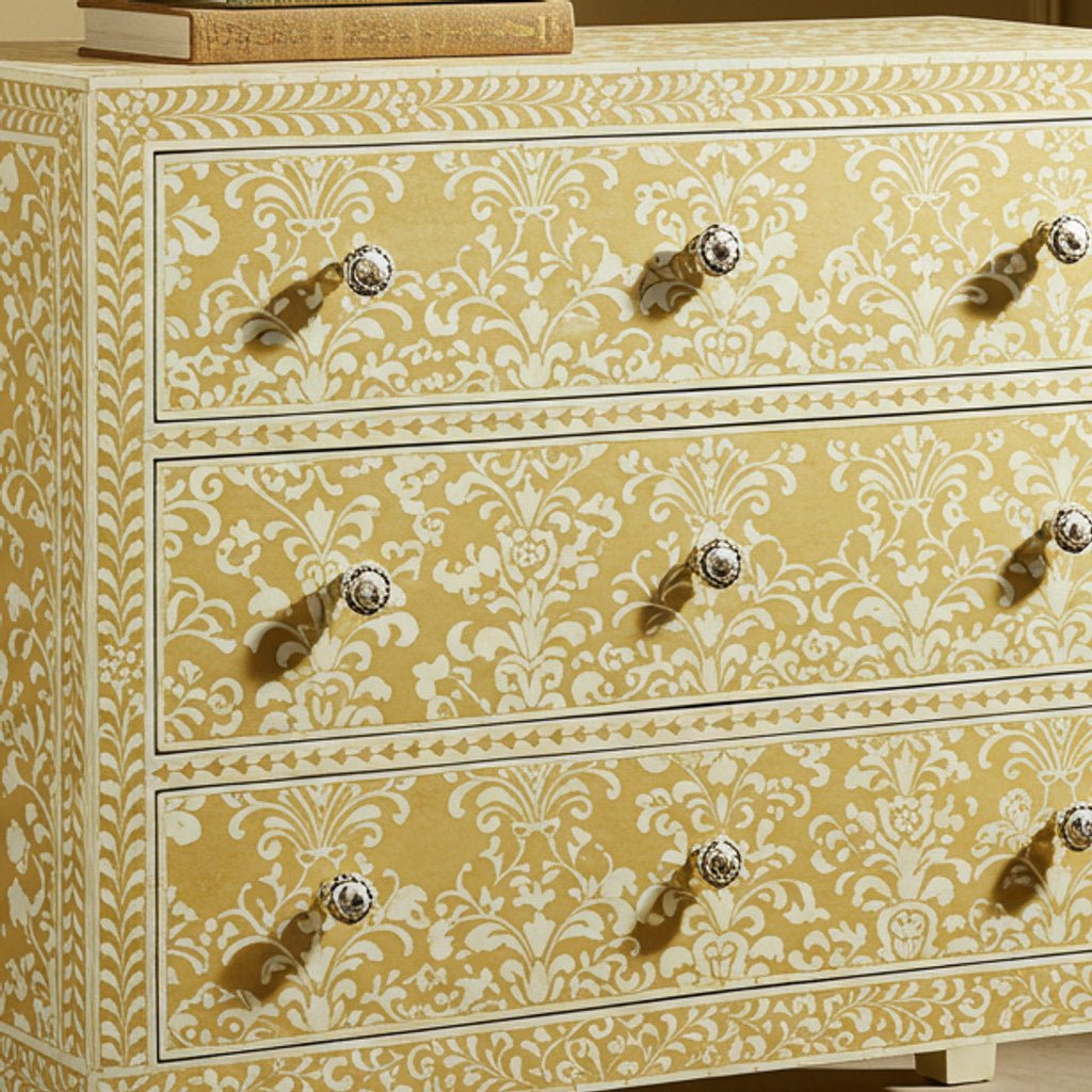 This beautifully crafted three-drawer chest features an intricate bone inlay design on a yellow background, blending traditional craftsmanship with practical storage. The chest is adorned with delicate floral motifs and elegant drawer pulls, making it a statement piece for any room.