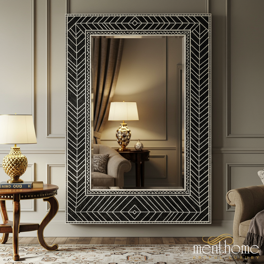 A stylish and elegant large wall mirror featuring a black frame with intricate white geometric patterns. Perfect for adding a touch of sophistication to any living room, bedroom, or hallway.