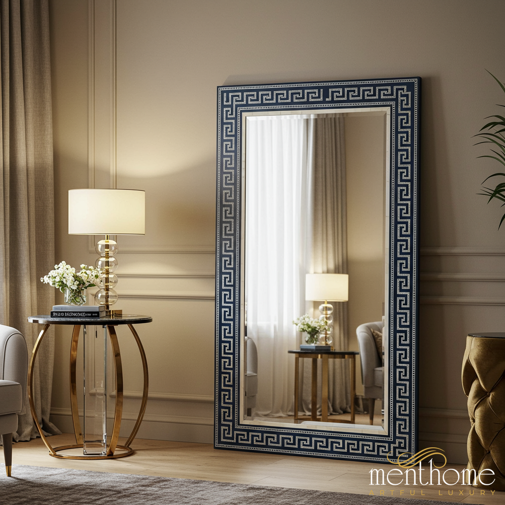A stylish large floor mirror featuring a bold Greek key patterned frame in navy blue and white, ideal for adding an elegant touch to any living room, bedroom, or hallway.