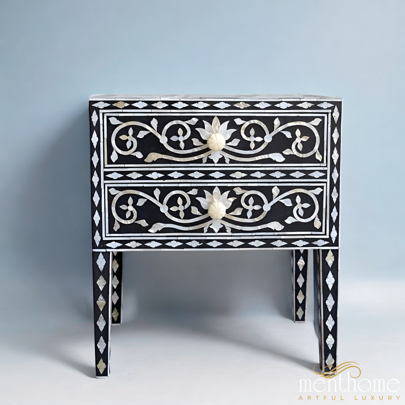 Lotus Pattern Nightstand With Two Drawer Bone Inlay | Luxury Handmade Bedside Table