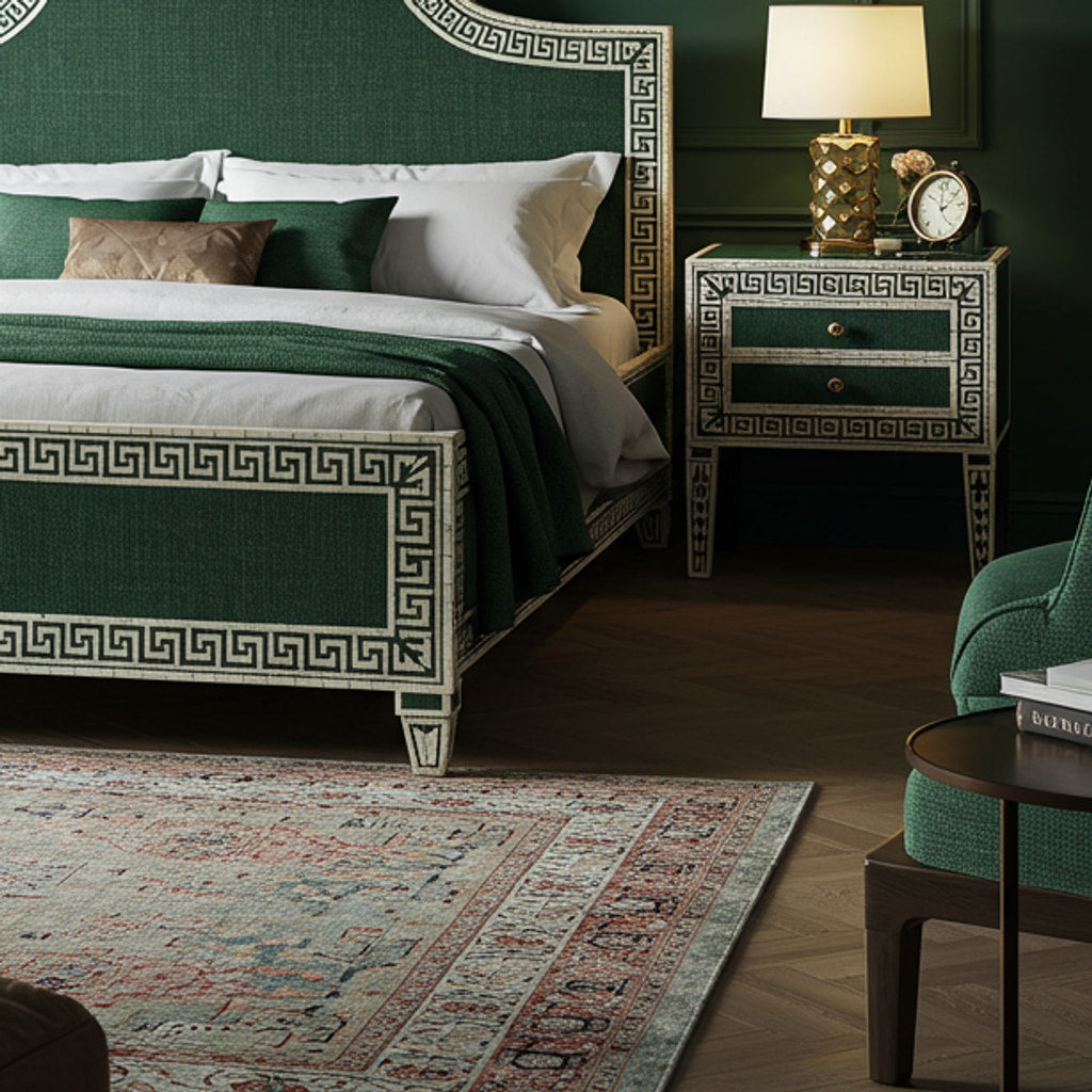 This exquisite king-size bed features a rich green upholstered frame adorned with an elegant Greek key pattern in contrasting white trim. Paired with matching nightstands, this set brings a sophisticated and harmonious atmosphere to any bedroom. The plush fabric and intricate detailing evoke timeless luxury and refined comfort.