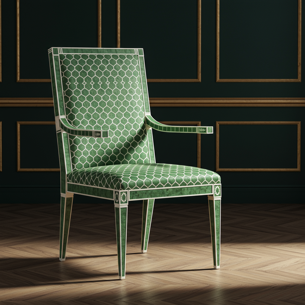 An exquisite armchair featuring a green geometric pattern with elegant inlay detailing. Crafted for both comfort and artistic appeal, this chair makes a sophisticated statement in any upscale living or office space.