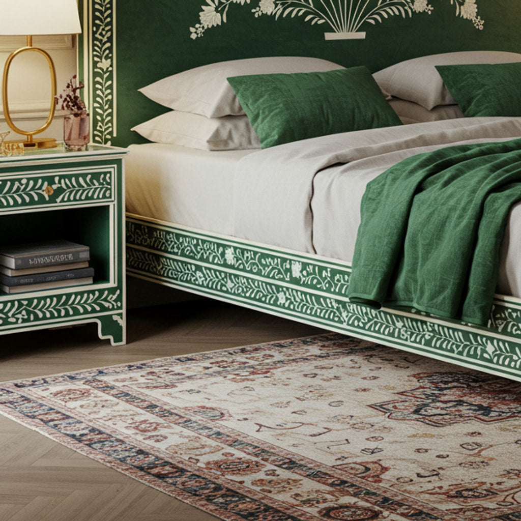 Luxurious Hand-Painted Green Floral Velvet Bed