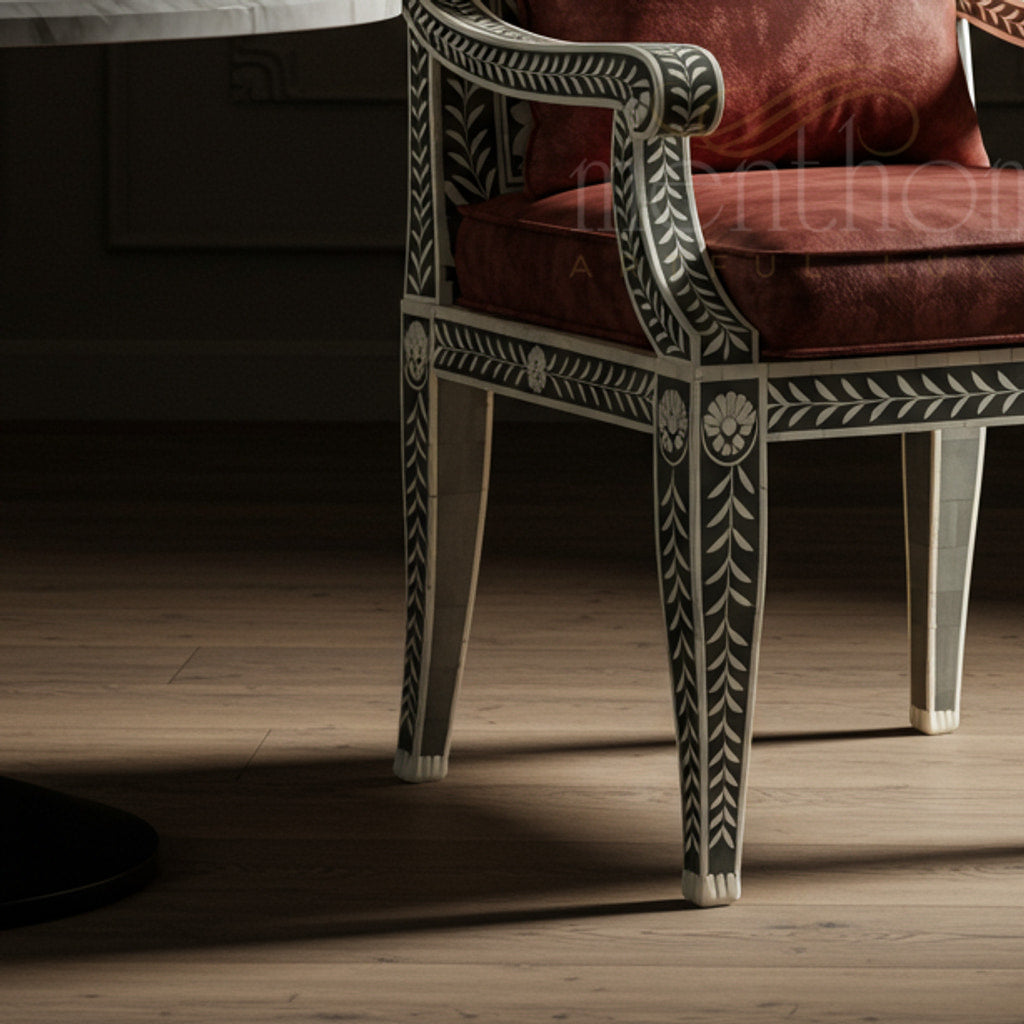 This exquisite Inlay Chair features intricate handcrafted floral inlay work on a solid wood frame, complemented by plush deep red cushions for unparalleled comfort. The elegant design combines traditional artistry with modern luxury, making it a statement piece for any sophisticated interior.