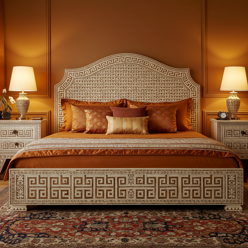 This opulent king-size bed set features intricate geometric and floral inlaid patterns on the headboard, footboard, and matching nightstands. Crafted with precision, it exudes a regal aesthetic combined with rich, warm tones that complement the elegant rust-colored bedding. The set includes two bedside tables with matching motifs and sophisticated hardware, ideal for a refined bedroom decor.
