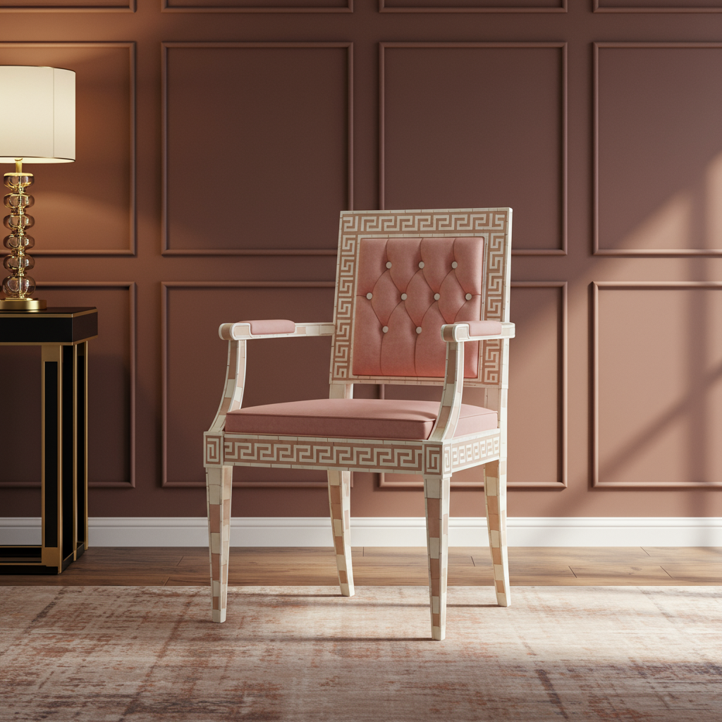 A sophisticated inlay armchair featuring elegant geometric patterns on a finely crafted wooden frame with plush, tufted leather upholstery in a warm rose hue. Perfectly designed to blend classic artistry with modern comfort for upscale interiors.