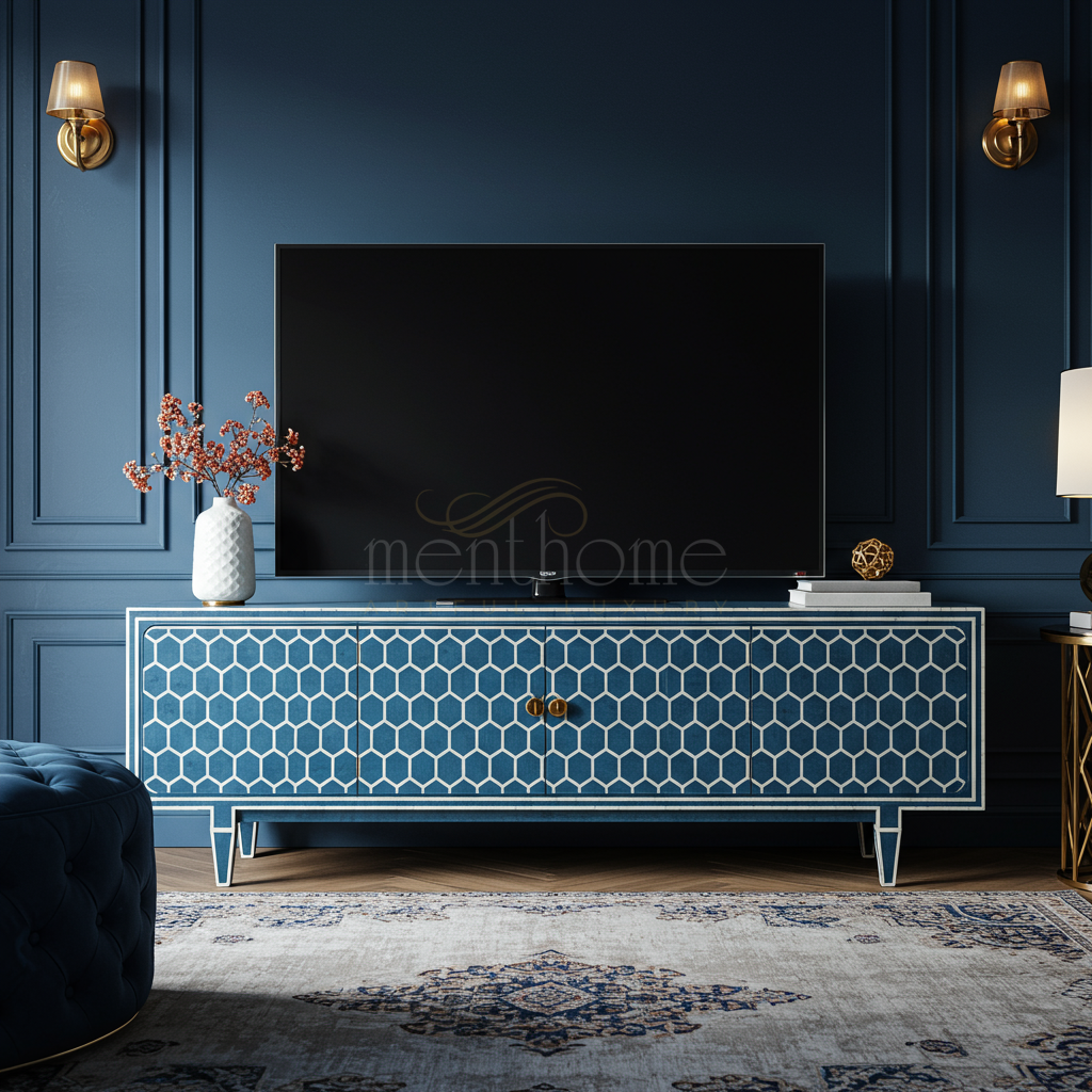 Luxurious Inlay Blue Hexagon Pattern TV Cabinet | Luxury Handmade TV Cabinet