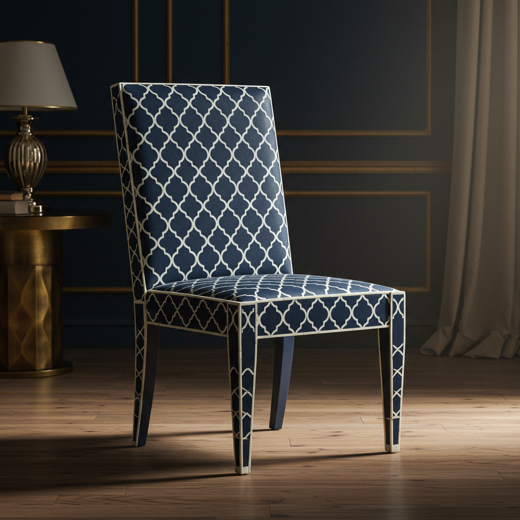 This exquisitely crafted Inlay Chair features a sophisticated navy and cream geometric pattern that elevates any dining or sitting area. With its high backrest and sleek, tapered legs, it marries style and comfort, making it an ideal luxury accent piece for upscale interiors.