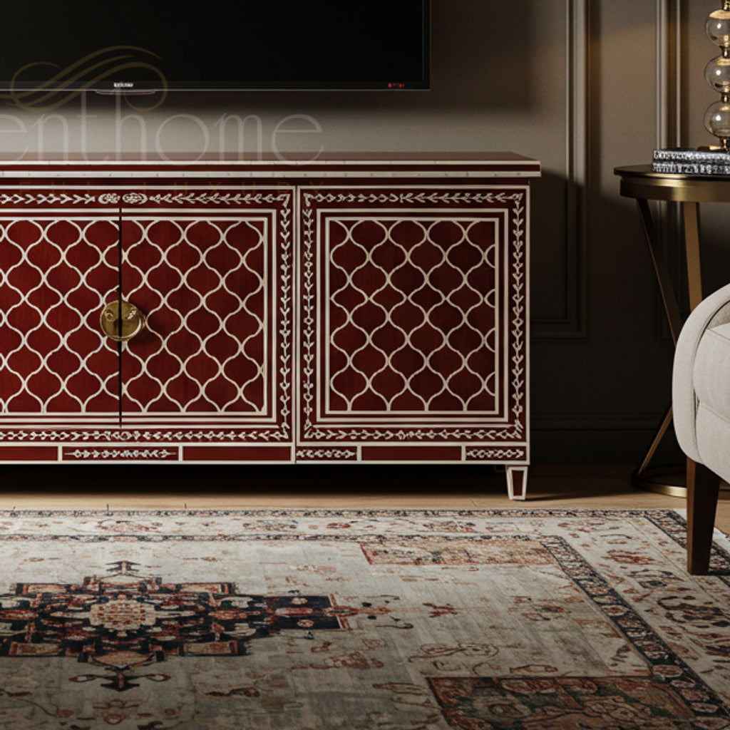 This sophisticated TV cabinet features intricate hand-crafted inlay work in a bold red and white pattern, creating a statement piece that effortlessly blends traditional craftsmanship with modern elegance. It offers ample storage with three paneled doors, complete with elegant brass knobs, making it the perfect addition to any living room or media space.