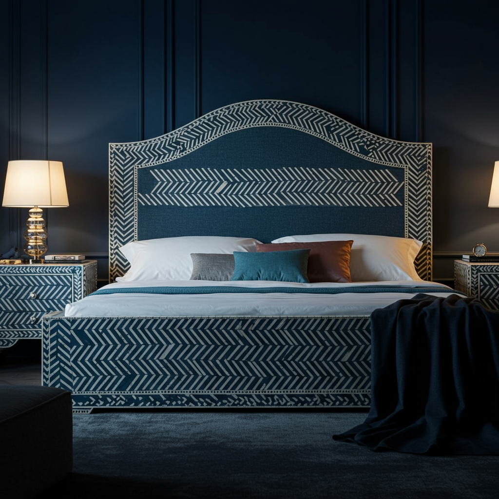 Luxurious Navy Blue Patterned Upholstered Bed Frame