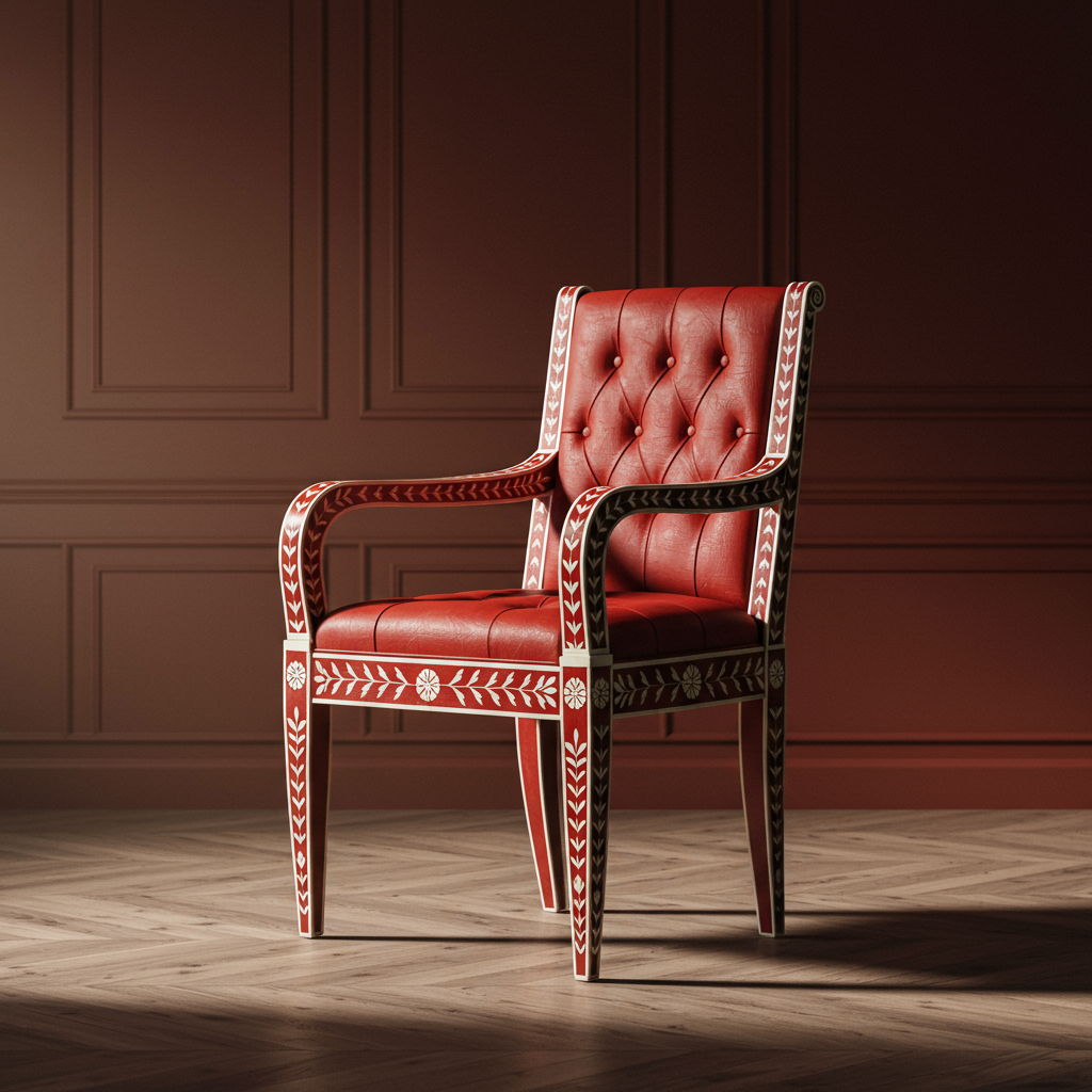 A finely crafted armchair featuring rich red leather upholstery and elegant white floral inlay detailing on a sturdy wooden frame. This chair combines classic design with sophisticated artisan craftsmanship, making it a statement piece for any upscale interior.