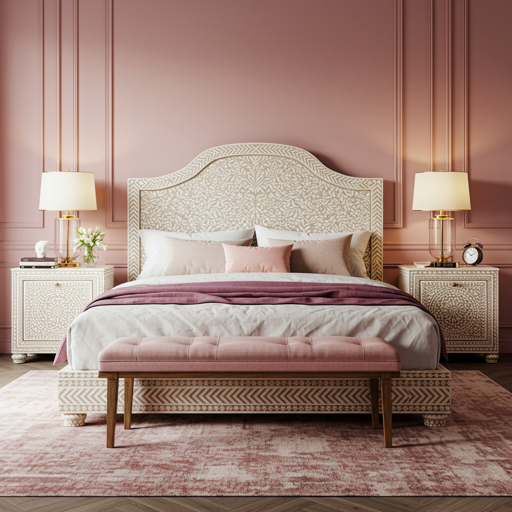 Exude timeless elegance with this luxury artisan-inlaid king bed featuring intricate floral and geometric patterns, complemented by matching nightstands and a plush upholstered bench. Crafted to elevate your bedroom decor, this set blends hand-carved artistry with refined comfort in a harmonious pink and beige palette.