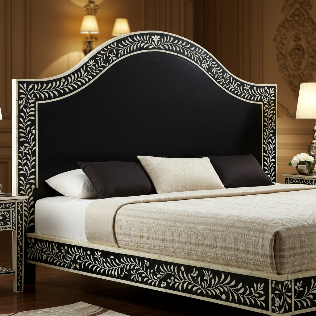 This exquisite king-sized bed features a striking black finish complemented by intricate ivory floral inlay patterns. The elegantly curved headboard and matching frame detail add a refined touch to any luxury bedroom setting. Crafted for both beauty and comfort, this bed serves as a stunning centerpiece.