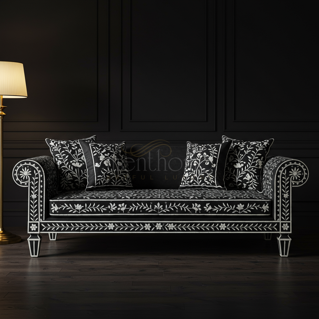 This exquisite inlay sofa features a striking black upholstery adorned with intricate white floral patterns. The elegant craftsmanship highlights detailed inlay work on the arms, cushion edges, and base, making it a statement piece for upscale interiors. Perfectly complementing sophisticated living spaces, it offers both comfort and artistic charm.