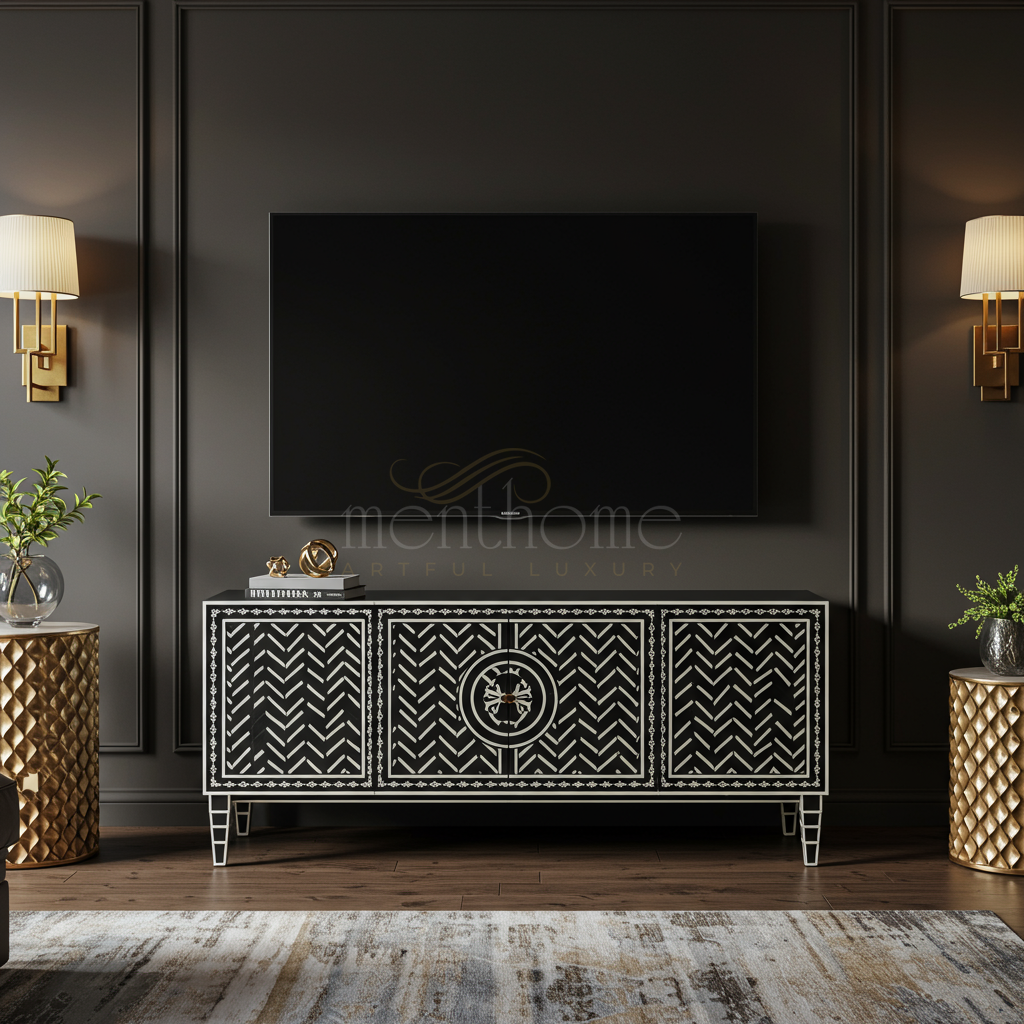 This luxury TV cabinet features a striking black finish with intricate white inlay patterns. Designed to blend artful craftsmanship with elegance, it serves as both a functional media unit and a statement piece in sophisticated living spaces.
