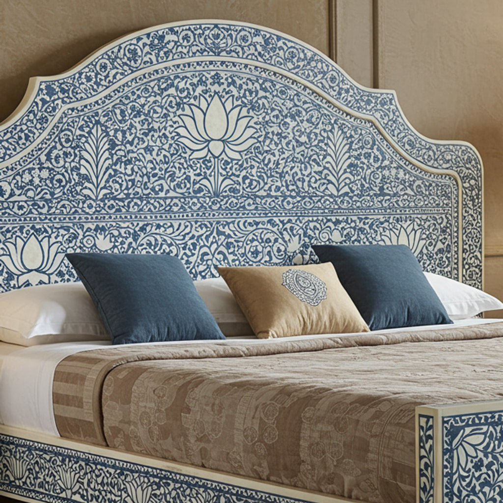 An exquisitely crafted king-sized bed adorned with intricate blue and white floral inlay detailing, featuring a curved headboard and matching side tables, creating a perfect blend of traditional artistry and luxurious comfort.