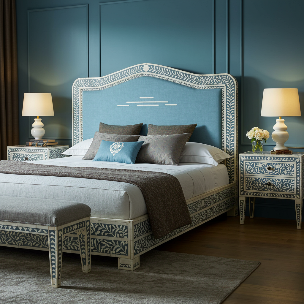 This elegant bedroom set features a beautifully upholstered bed with intricate floral patterns on the frame and headboard. The set includes two matching nightstands and a padded bench, all boasting the same delicate floral inlay design, finished in calming shades of blue and cream. The plush blue fabric of the bed's headboard complements the dark blue wall behind, creating a serene and sophisticated ambiance.