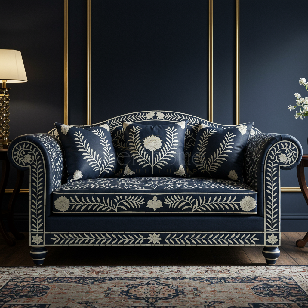 This exquisite blue sofa showcases intricate white floral and leaf inlay embroidery, combining traditional craftsmanship with contemporary elegance. Its sturdy wooden frame and plush cushioning offer supreme comfort and durability, making it a statement piece for any luxurious living space.