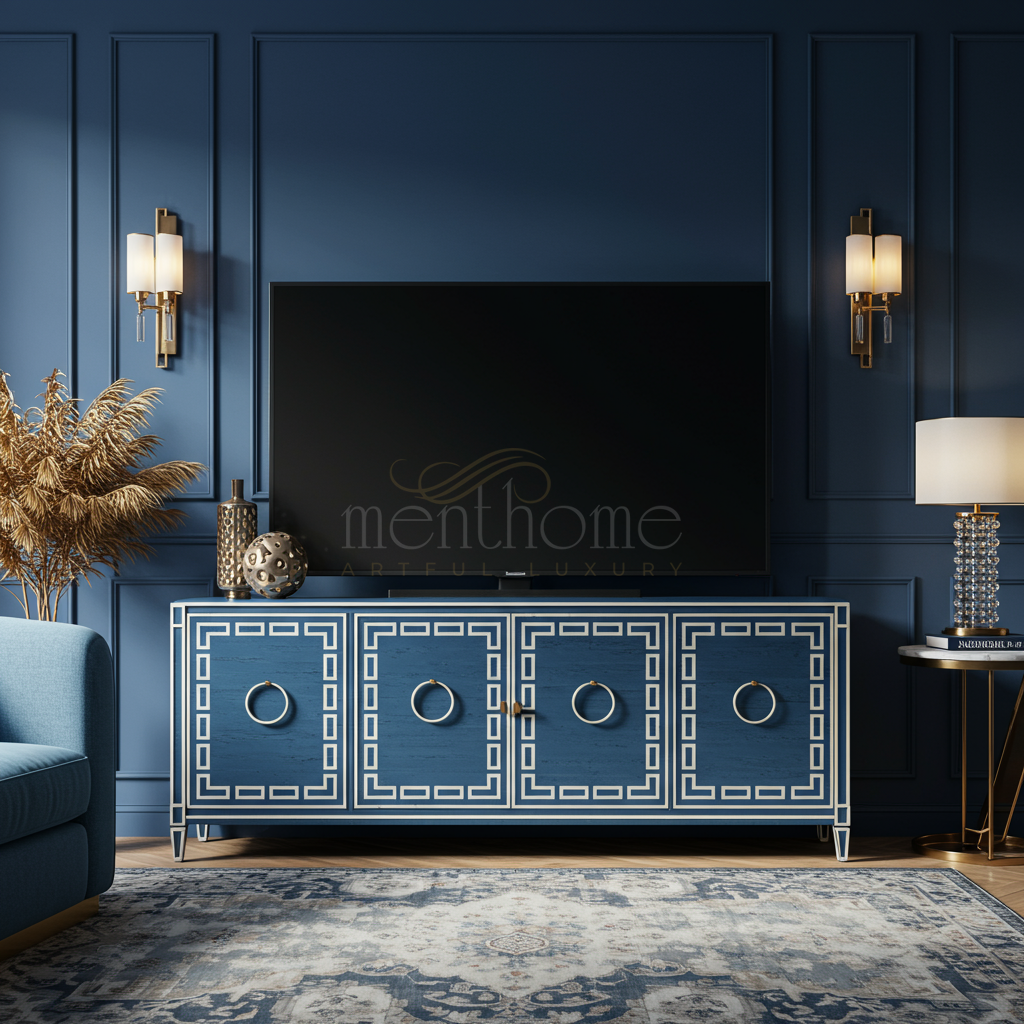 This exquisite luxury TV cabinet showcases a sophisticated blue finish with elegant white geometric inlay detailing. Designed to elevate any living room, the cabinet features four spacious doors with stylish round brass handles, offering ample storage for media equipment and accessories. Crafted to combine artful luxury with functionality, it complements both classic and contemporary interiors.