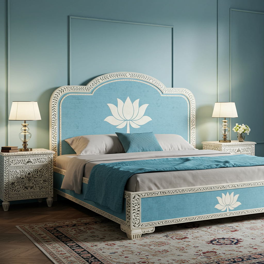 Experience sublime comfort and artisan craftsmanship with this luxury king size bed featuring an elegant blue upholstered frame adorned with intricate lotus motifs. Paired with two matching intricately carved nightstands, this set adds a sophisticated and serene ambiance to your bedroom. The detailed hand-painted floral patterns enhance its unique, artistic appeal, creating a timeless statement piece.