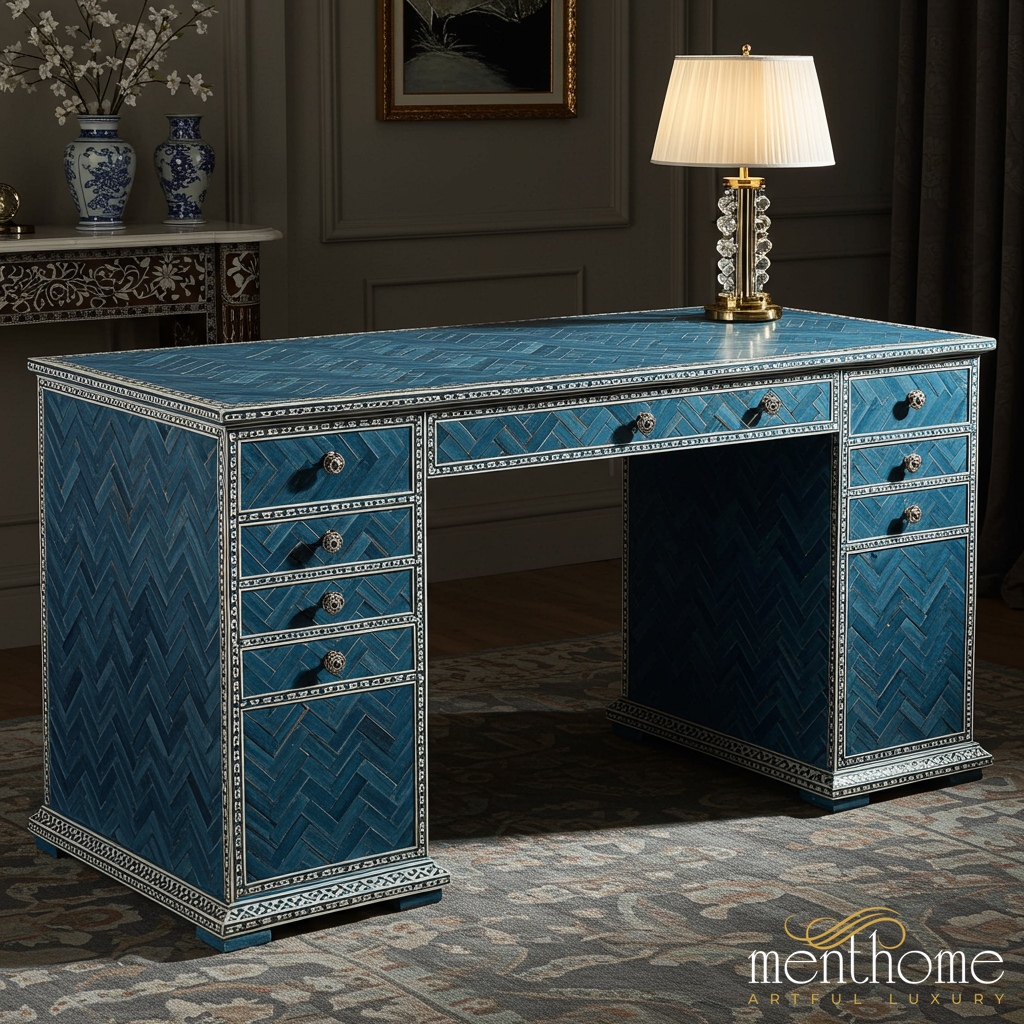 An elegant and spacious wooden desk featuring a blue herringbone pattern with intricate white detailing. Equipped with multiple drawers on both sides and in the center, this desk provides ample storage while serving as a statement piece in any sophisticated office or study.