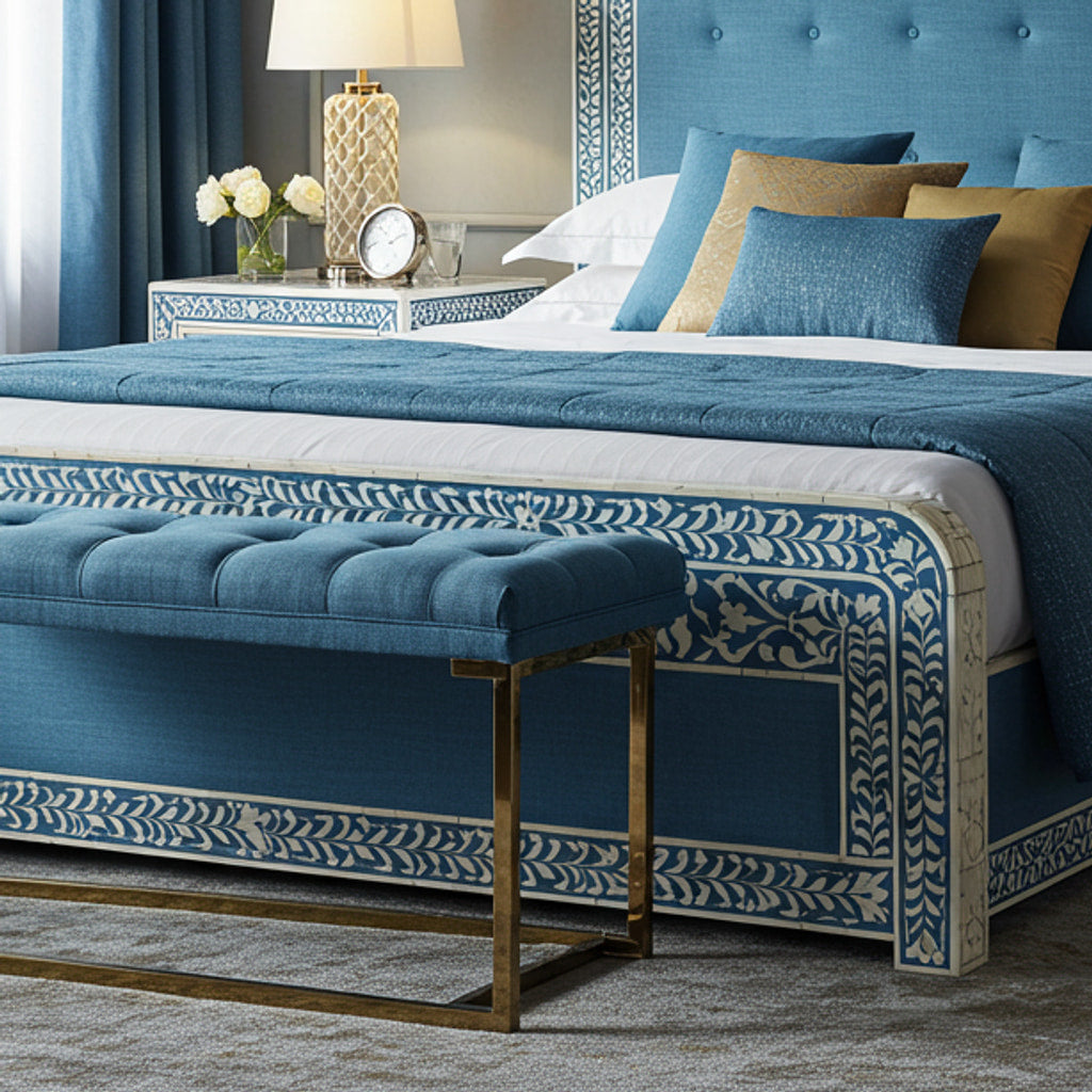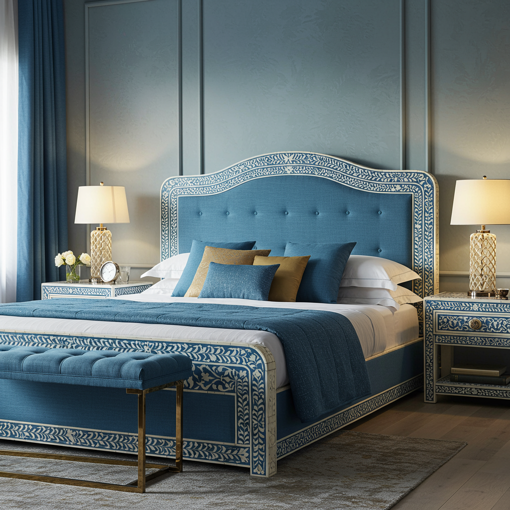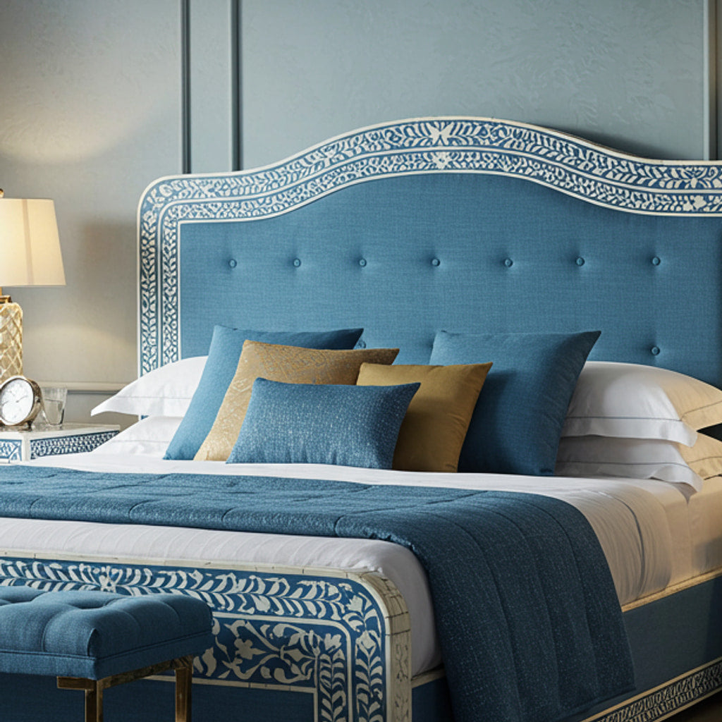 Luxury Blue Upholstered Bed with Intricate Bone Inlay Detailing
