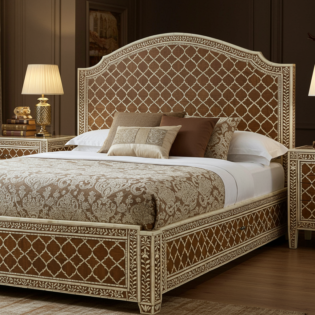 Luxury Brown and Ivory Inlaid Queen Bed