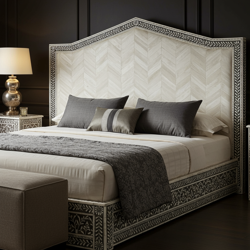 This exquisite king-size bed features an intricately carved bone inlay frame and headboard, combining elegance and craftsmanship. The headboard is adorned with a refined herringbone pattern complemented by a detailed floral and leaf motif border, making it a statement centerpiece in any bedroom.