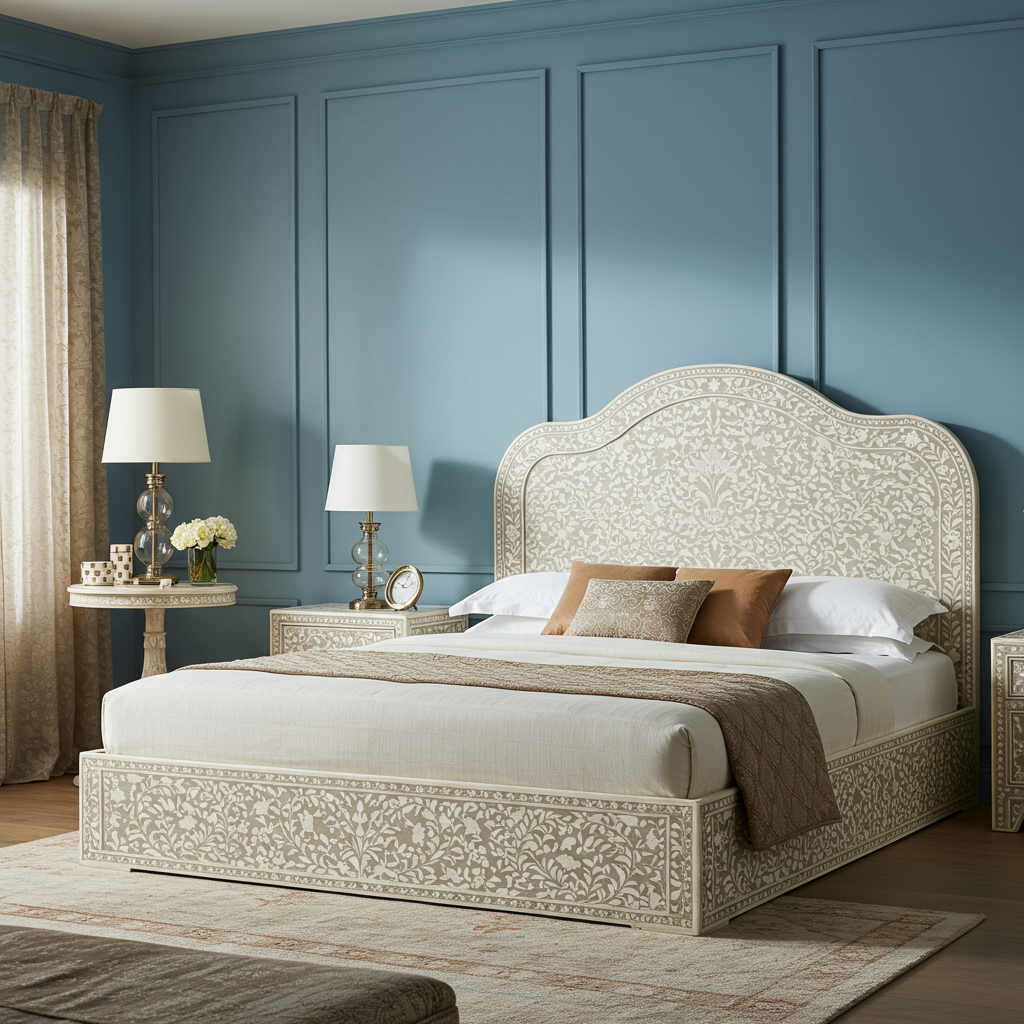 This exquisite queen bed features an intricately carved floral pattern on the headboard, footboard, and frame. Crafted for elegance and comfort, it perfectly complements sophisticated bedroom interiors with its cream and beige hues. The gently curved headboard adds a regal touch to your sleeping space.
