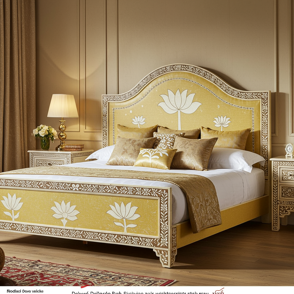 This exquisite king size bed features a sophisticated floral inlay design on a golden-yellow backdrop, blending classic craftsmanship with luxurious elegance. Perfectly suited for refined bedrooms, it offers both style and comfort.