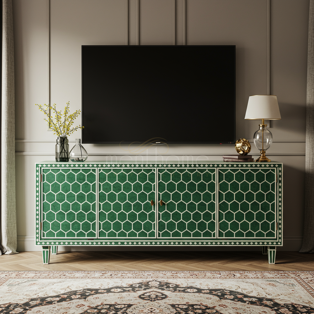 Luxury Green Inlay TV Cabinet with Geometric Pattern | Luxury Handmade TV Cabinet