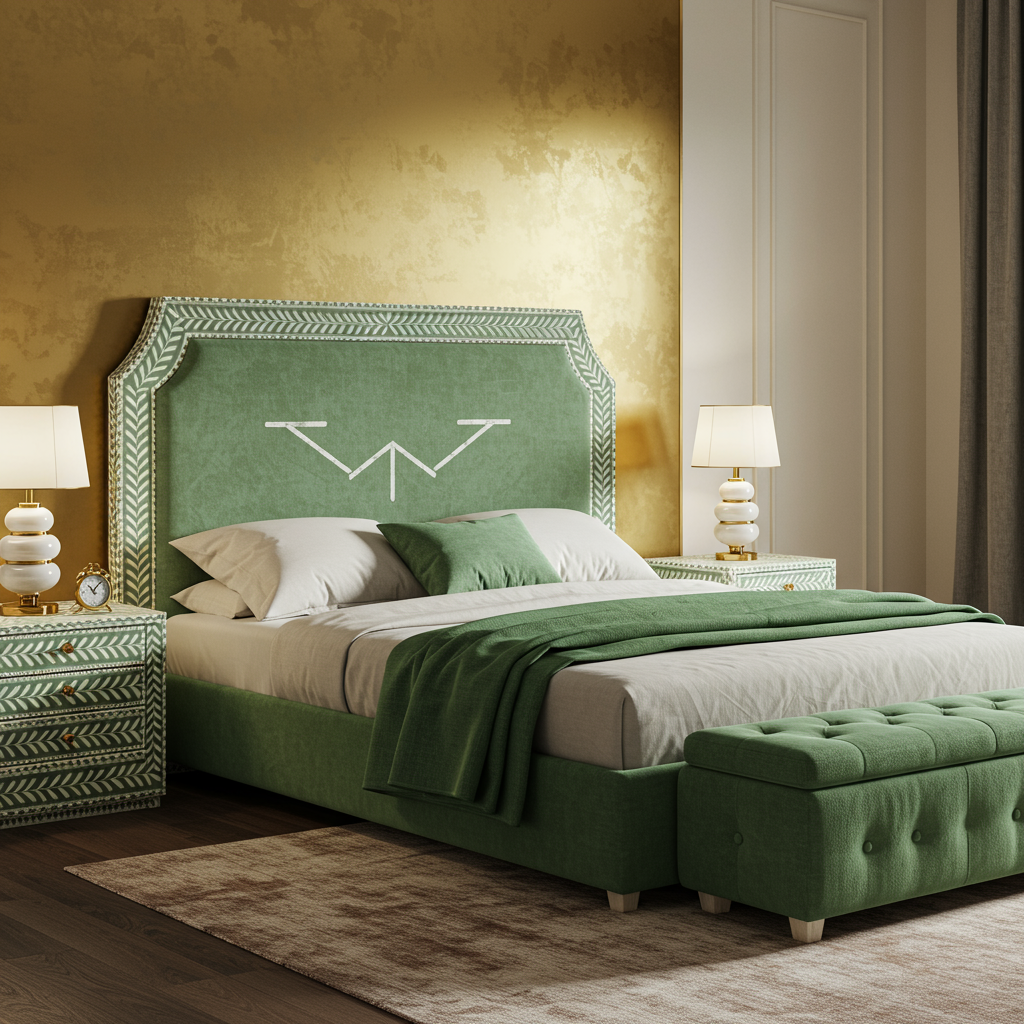 This exquisite luxury bedroom set features a stately green upholstered bed with a high, detailed headboard adorned with a subtle white decorative pattern. The set includes a matching upholstered bench at the foot of the bed and two coordinated nightstands with intricate leaf-pattern designs. Soft golden wall accents and elegant white lamps complement this sophisticated ensemble, perfect for elevating any master bedroom with refined comfort and style.
