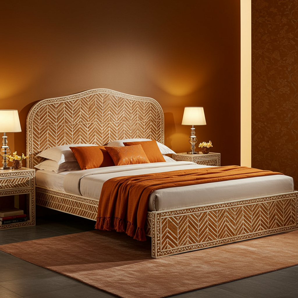 A beautifully designed king-sized bed featuring luxurious hand-carved bone inlay in a warm burnt orange and cream pattern. This bed is complemented by matching bedside tables and accentuated with elegant bedding and pillows in coordinating autumn hues, creating a sophisticated and cozy bedroom ambiance.