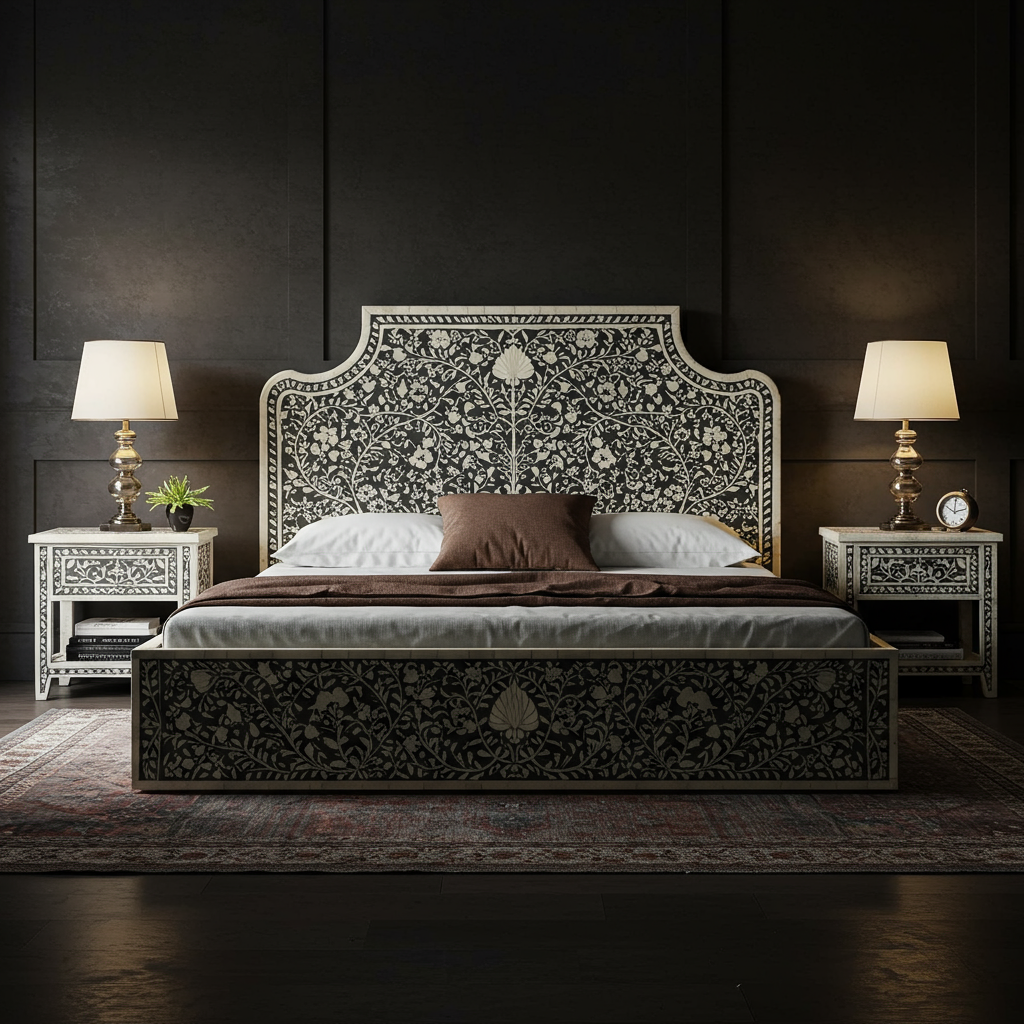 This exquisite king-size bed features intricate hand-carved floral and vine inlay designs, creating a lavish and timeless centerpiece for your bedroom. Paired with matching nightstands adorned with the same intricate craftsmanship, this set exudes sophistication and artisanal quality. Finished in a contrasting black and white palette, it blends traditional artistry with modern luxury, ensuring a statement of elegance in any upscale living space.