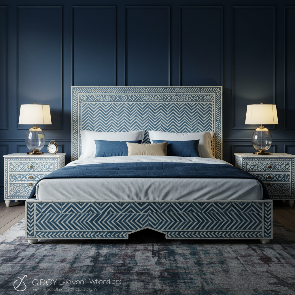 - Handcrafted bone and resin inlay detailing on bed frame and nightstands
