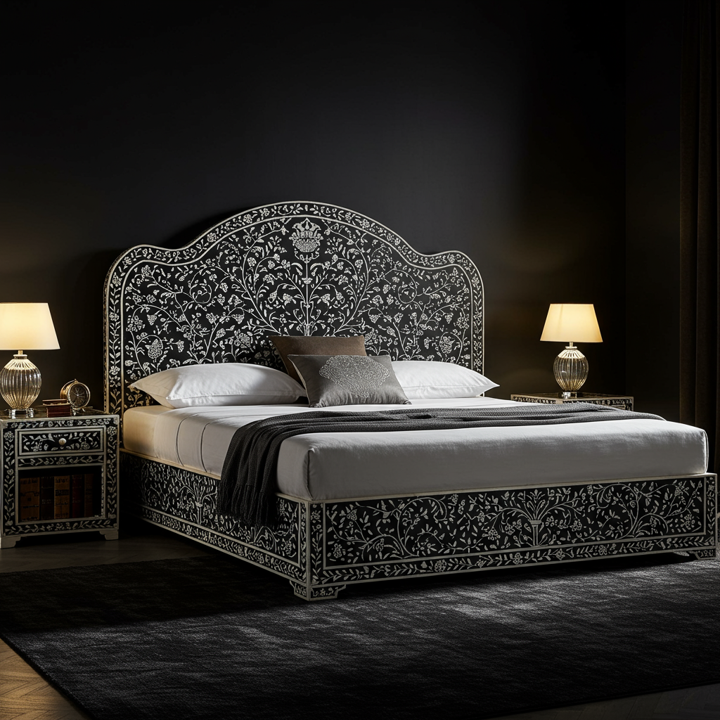 Experience elegance and craftsmanship with this Luxury Handcrafted Inlay King Bed, featuring intricate floral and vine patterns in a striking black and white color scheme. Matched with two complementary inlay nightstands, this set adds sophistication and charm to your master bedroom.