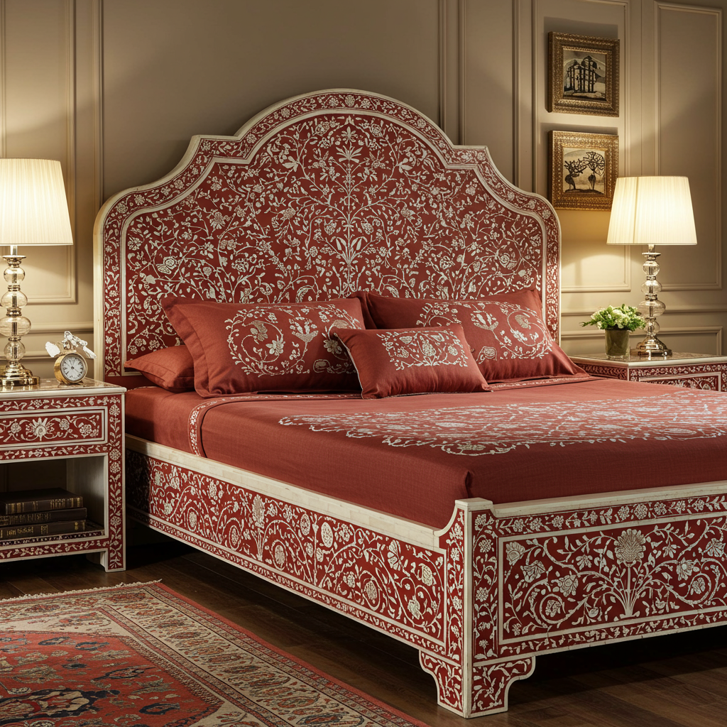 Experience elegance and craftsmanship with this luxury handcrafted king-size bed, featuring intricate white floral inlay designs on a rich red base. The bed includes a statement arched headboard and matching bedside tables, creating a cohesive and opulent look for any upscale bedroom.