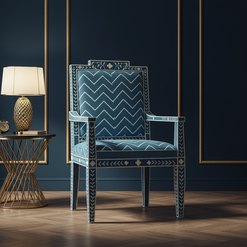 This exquisite Inlay Chair features a hand-crafted wooden frame adorned with intricate white inlay detailing. The plush blue upholstery is patterned with a striking chevron design, blending elegance and comfort. Perfect for adding a sophisticated touch to any living room or study.