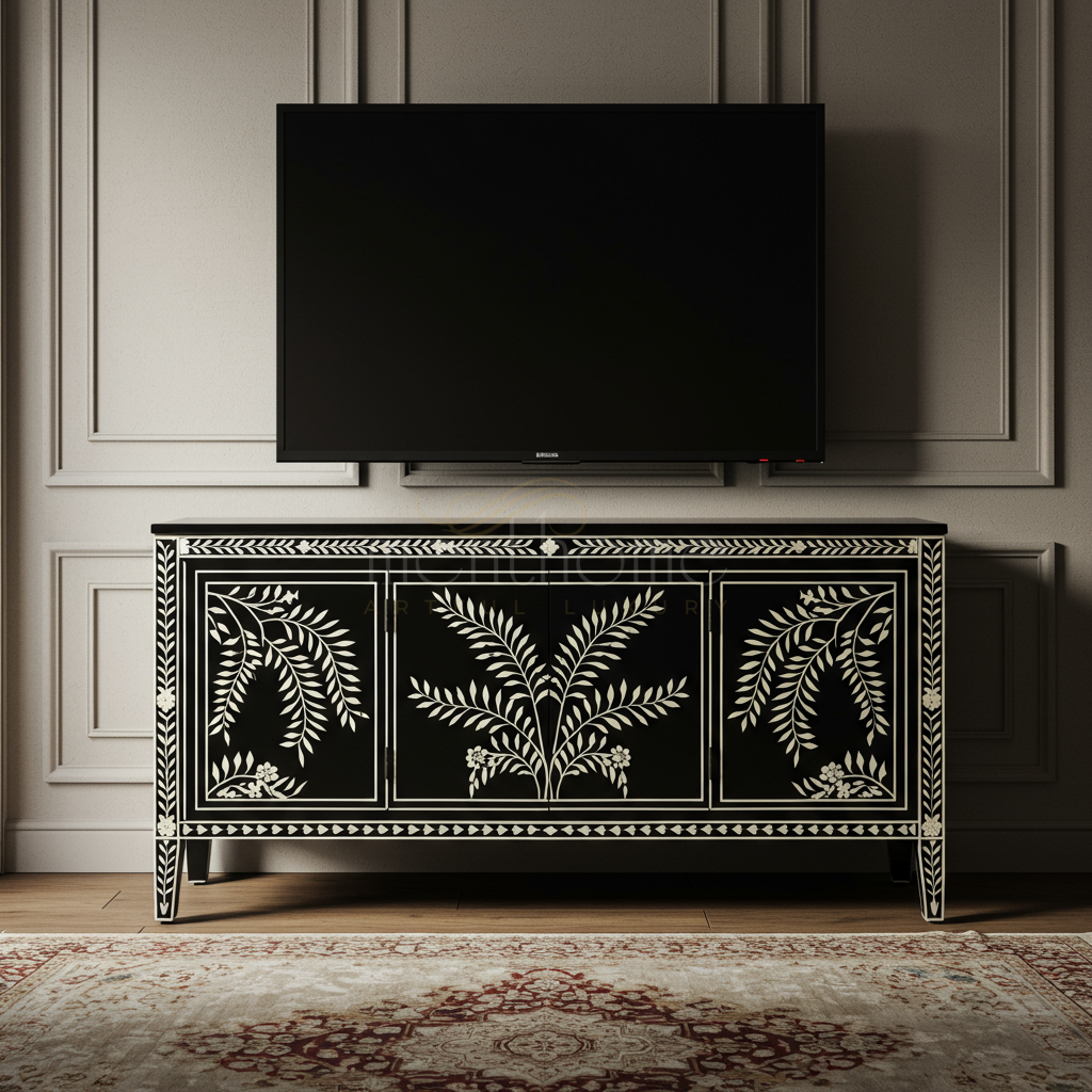 Luxury Inlay Black TV Cabinet with Botanical Motif | Luxury Handmade TV Cabinet