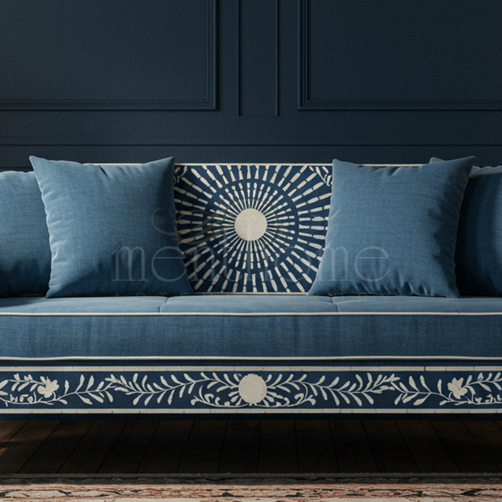 This exquisite luxury sofa features a rich blue upholstery complemented by intricate white floral inlay designs on the frame and arms. Designed to combine comfort with artistic elegance, it includes plush cushions and a sturdy wooden base finished with beautiful inlay craftsmanship, making it a standout piece for sophisticated living rooms.