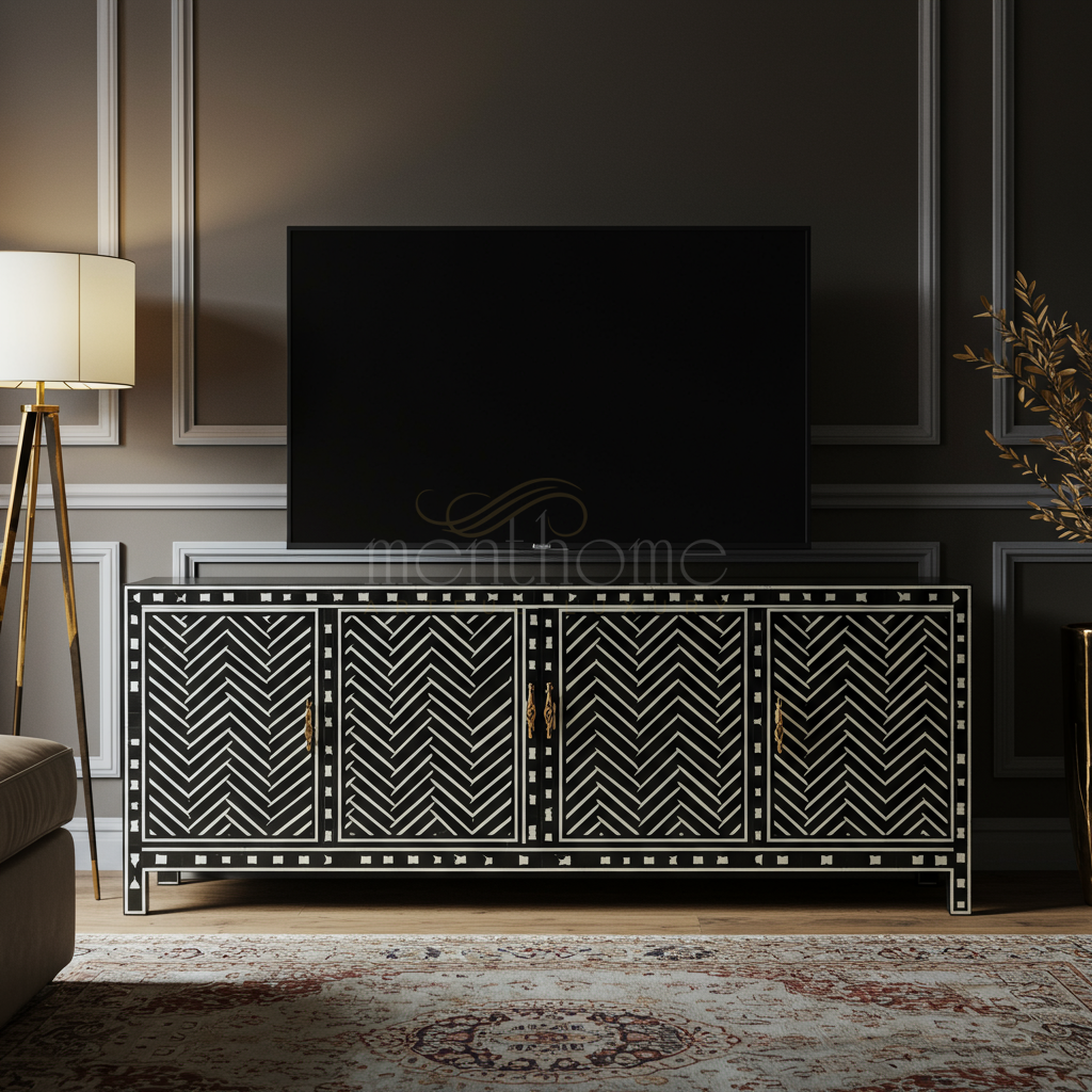 This exquisite TV cabinet features intricate bone inlay craftsmanship with a striking black and white herringbone pattern. Elegant brass handles add a touch of sophistication, making it a perfect centerpiece for any upscale living room. The cabinet provides ample storage with four doors, blending traditional artistry with modern functionality.