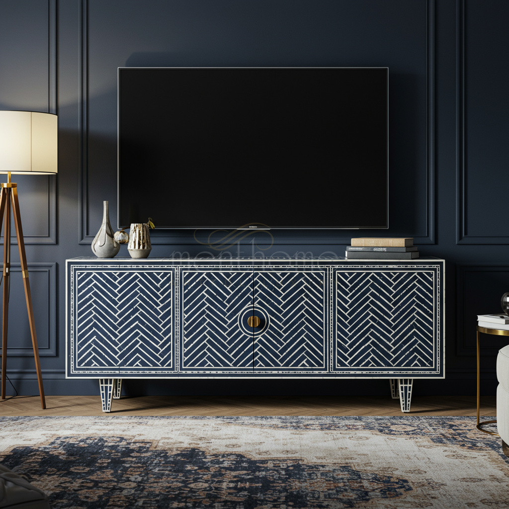 This exquisite TV cabinet features an intricate bone inlay pattern set against a sophisticated navy blue finish. Crafted for elegance and functionality, it boasts ample storage with three compartments concealed behind paneled doors, perfect for organizing media essentials while enhancing your living space with a timeless design.