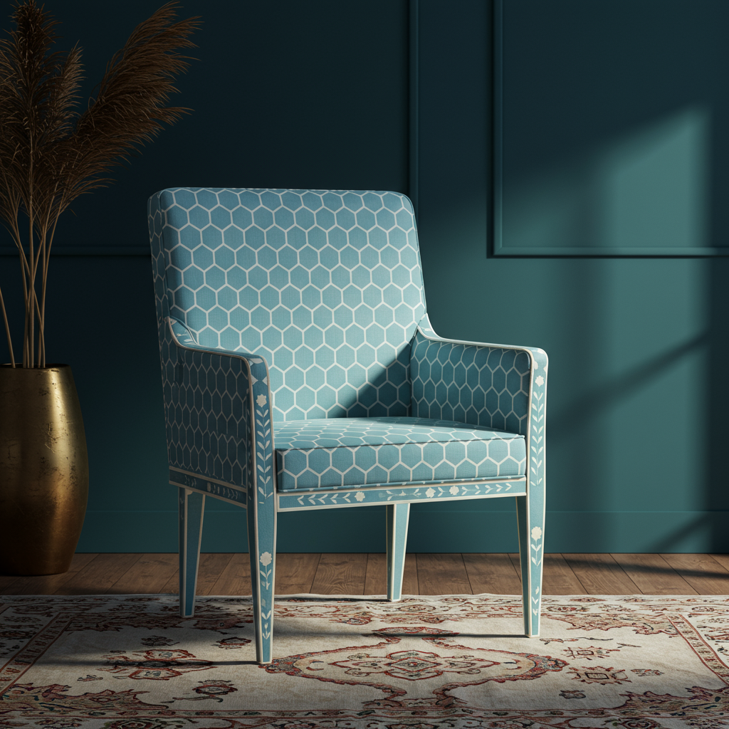 Luxury Inlay Chair with Blue Geometric Upholstery | Luxury Handmade Chair