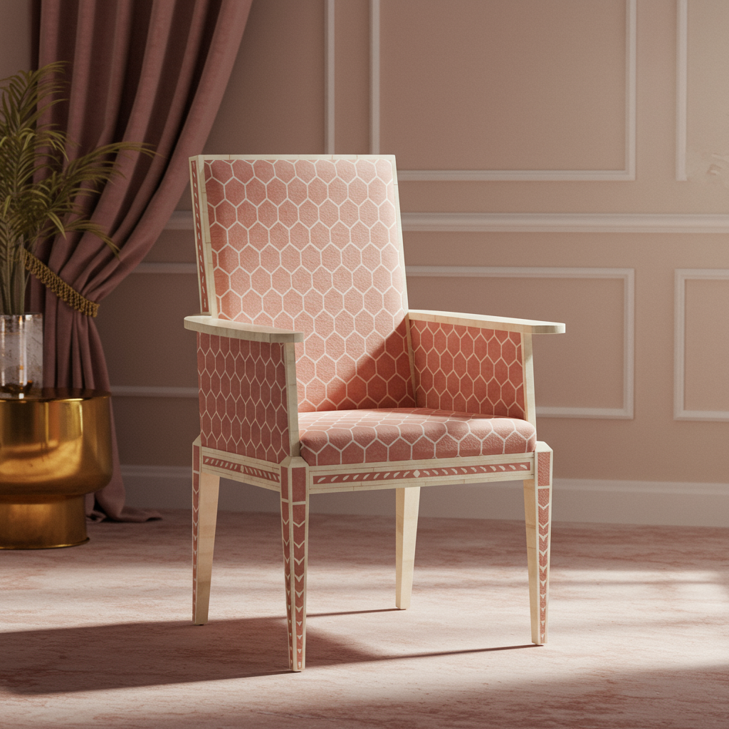 This exquisite Inlay Chair features a refined honeycomb pattern upholstery paired with a delicately inlaid wooden frame, creating a harmonious blend of comfort and artful design. Perfect for luxury interiors, the chair's soft pink tones and elegant detailing elevate any living space with a touch of sophistication.