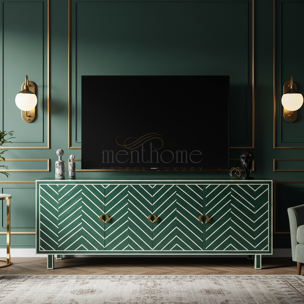 A premium TV cabinet featuring intricate hand-crafted inlay with a bold chevron pattern in deep emerald green and white tones. Designed with elegant brass accents on the handles and a refined frame, this cabinet effortlessly combines functionality with artistic luxury.