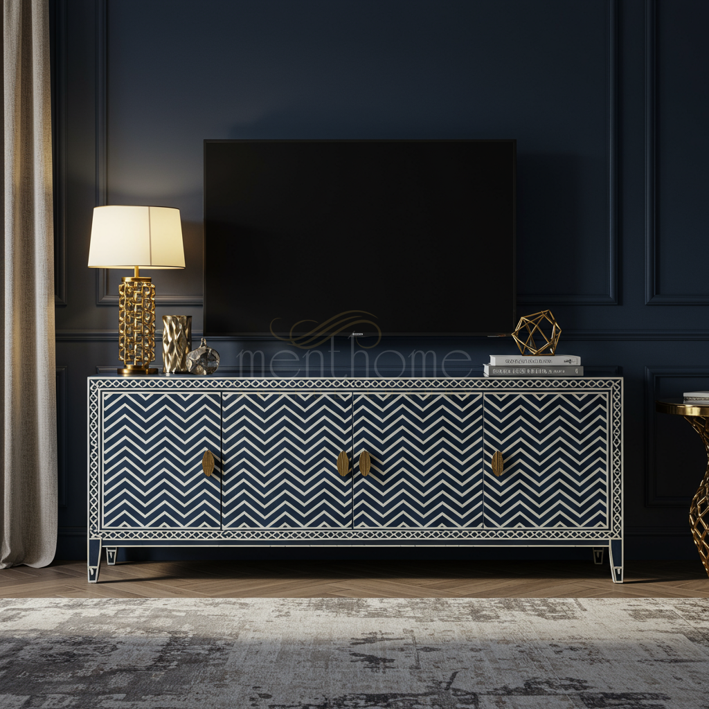 This elegant TV cabinet features a striking navy and white chevron inlay design, bordered by intricate geometric patterns. Crafted with attention to detail, it blends functionality and style, offering ample storage with its four doors accented by gold-toned handles, perfect for a sophisticated living room setup.