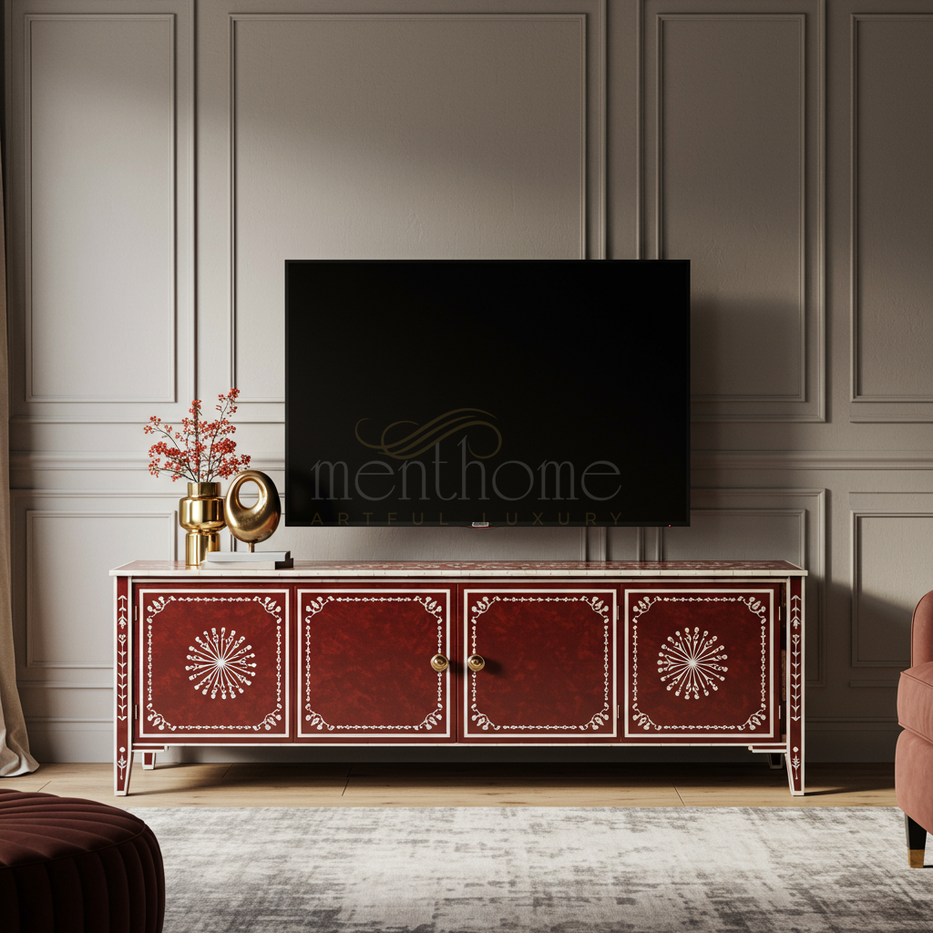 Luxury Inlay Handcrafted TV Cabinet with Marble Top | Luxury Handmade TV Cabinet