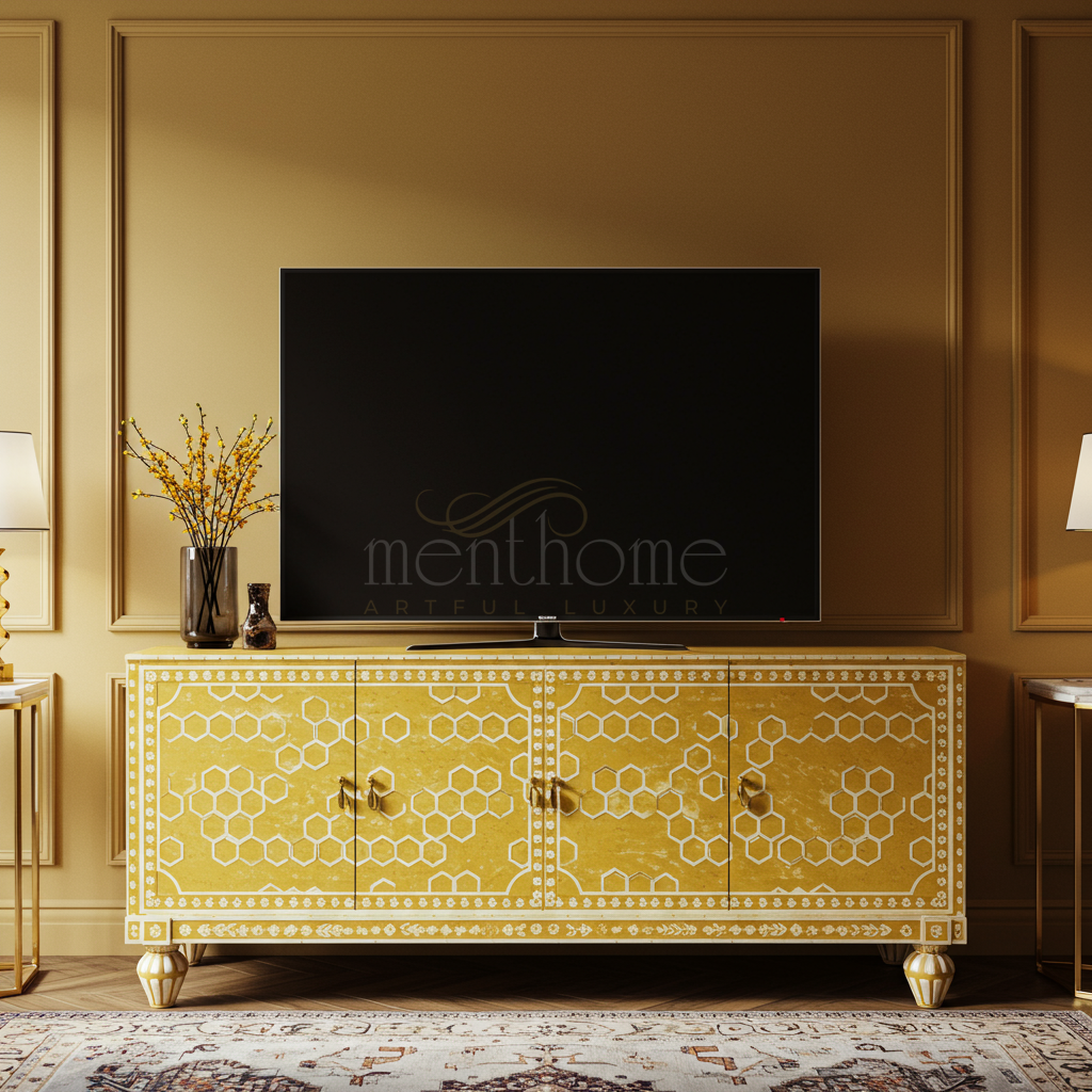 Elevate your living space with this luxury TV cabinet featuring an intricate honeycomb inlay design. Crafted with a glossy yellow finish and golden accents, this cabinet combines artistic luxury with practical storage solutions for modern homes.