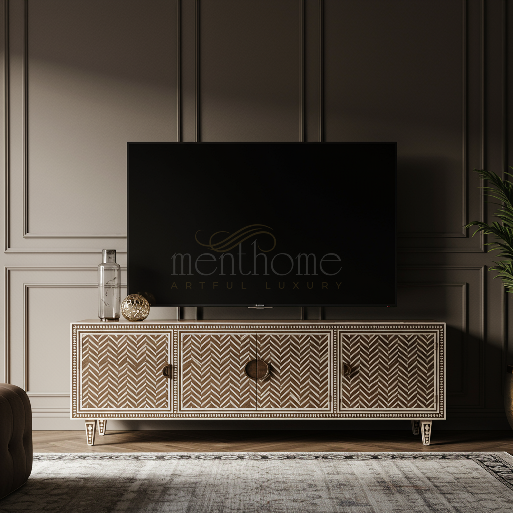 A beautifully crafted luxury TV cabinet featuring intricate bone inlay with a geometric herringbone pattern. This piece combines traditional craftsmanship with modern elegance, perfect for accentuating upscale living spaces.