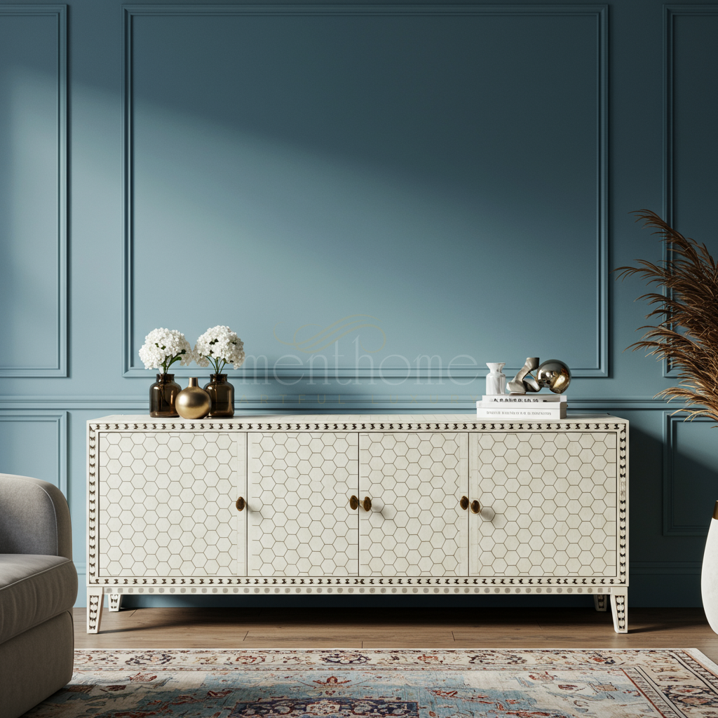 This exquisite TV cabinet features a delicate inlay design with a honeycomb pattern on the doors, framed by intricate border details. Crafted for luxury interiors, it offers ample storage with four doors and elegant brass handles, perfectly blending functionality with refined aesthetics.
